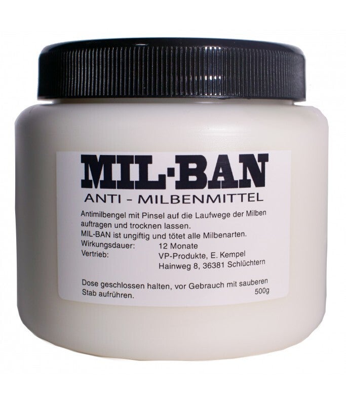Mil-Ban ist ein Antimilbenmittel, bestehend aus einer anorganischen Dispersion. Das Mittel wird auf die Laufwege der Milben gestrichen. Bei Berührung der Milben mit der trockenen Dispersionsschicht, führt dies zum sofortigen „Austrockenen“ der Milbe. Milban ist ungiftig! Hinweis: Das Mittel bitte nur extrem dünn verstreichen.